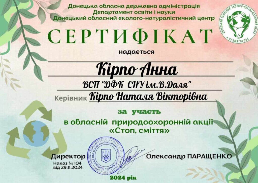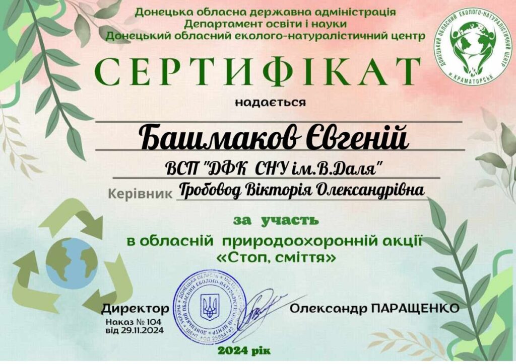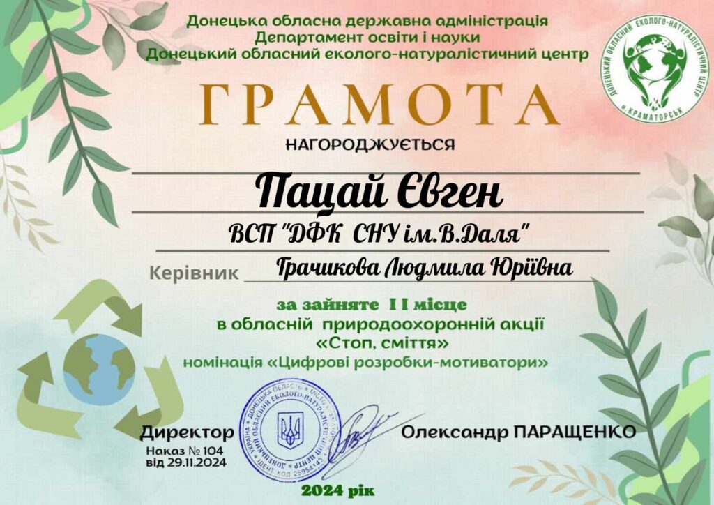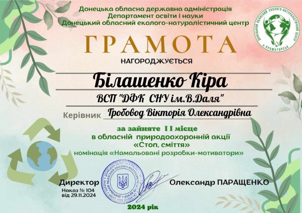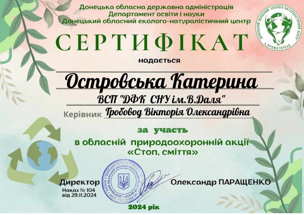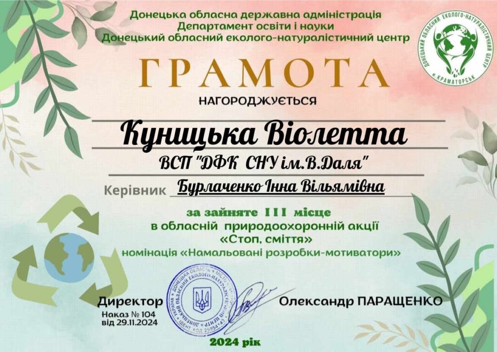 Вітаємо наших студентів з перемогами у конкурсі від Донецького обласного еколого-натуралістичного центру!