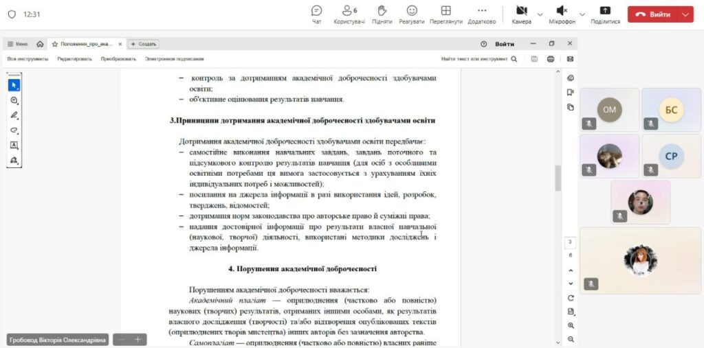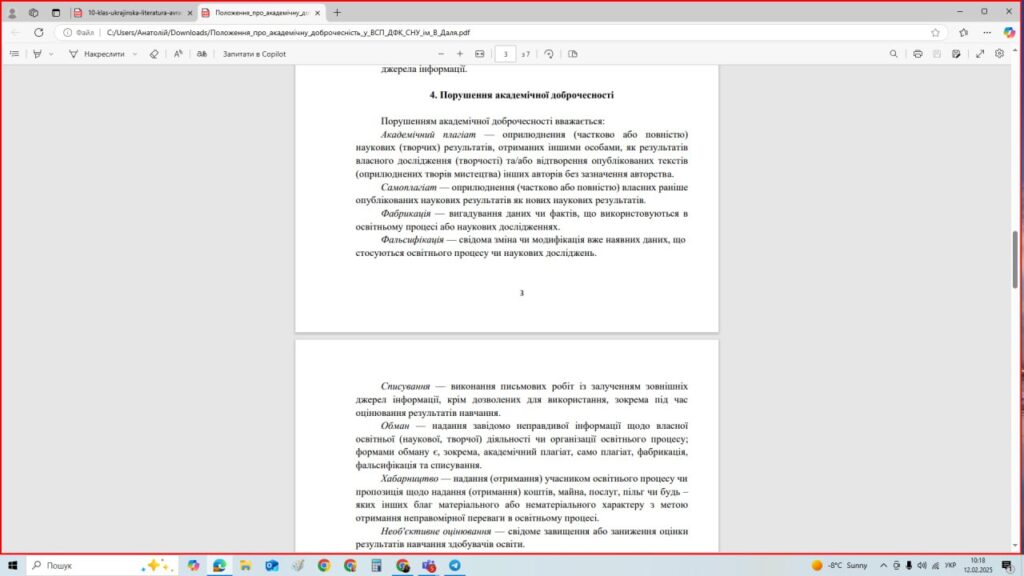 У ВСП “ДФК СНУ ім. В. Даля” провели виховну годину, щоб допомогти студентам зрозуміти важливість академічної доброчесності, ознайомитися з відповідними законами для формування правильного ставлення до навчання, а також нагадали, що в коледжі діє ПОЛОЖЕННЯ про Академічну доброчесність