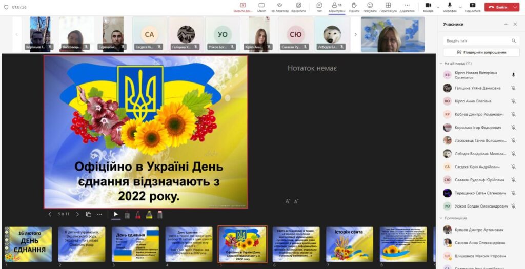 З нагоди цього дня у ВСП ДФК СНУ ім. В. Даля було проведено виховну годину, присвячену єдності українського народу, історичному шляху державотворення та ролі кожного громадянина у зміцненні країни. Виховна година розпочалася із виконання Державного Гімну України, що стало символічним нагадуванням про силу та непохитність нашої нації.