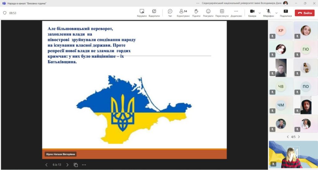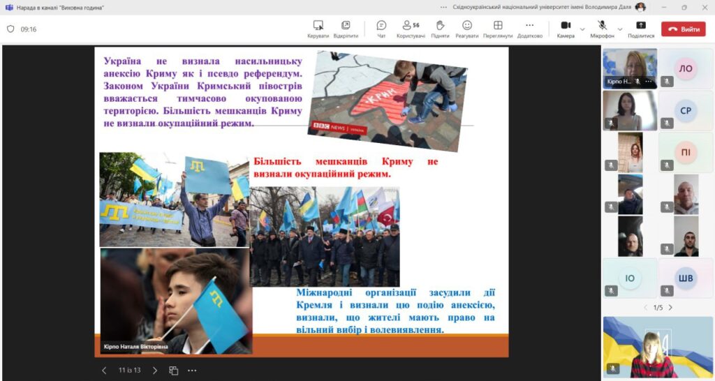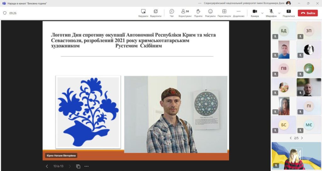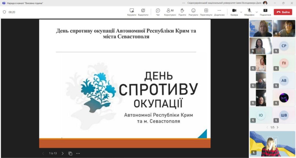 26 лютого 2025 року у Відокремленому структурному підрозділі Донецький фаховий коледж Східноукраїнського національного університету імені Володимира Даля Наталя КІРПО провела виховну годину, присвячена Дню спротиву окупації Автономної Республіки Крим та міста Севастополя. Цей захід мав на меті вшанувати мужність і героїзм громадян України, які проживають на тимчасово окупованих територіях, а також підвищити обізнаність студентів про події, що відбулися в Криму у 2014 році.
