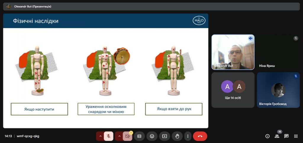 Під час заходу учасники дізналися про різновиди вибухонебезпечних предметів: від протипіхотних мін до касетних боєприпасів і саморобних пристроїв. Спікер наголосив, що ці об’єкти можуть виглядати як звичайні речі, що робить їх підступними для необізнаних. За допомогою наочних матеріалів — фотографій — студенти та викладачі ознайомилися з ознаками таких предметів і основними правилами поведінки.
