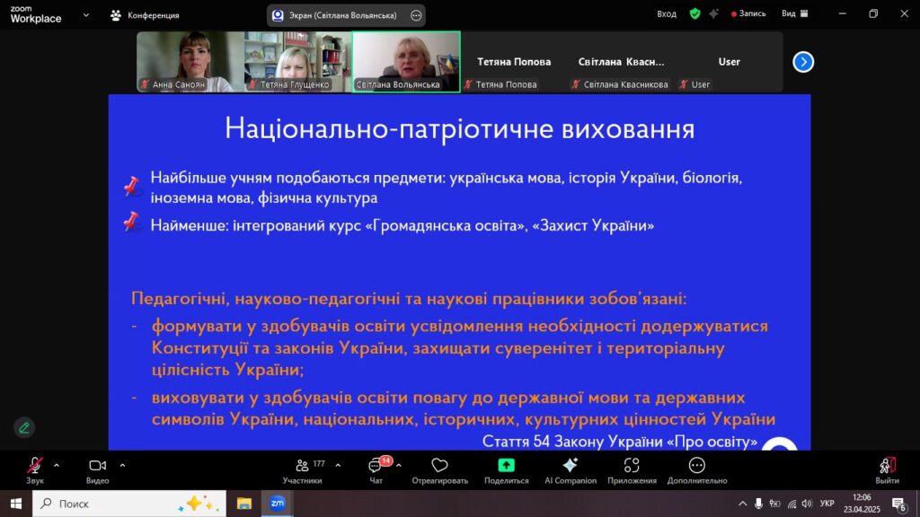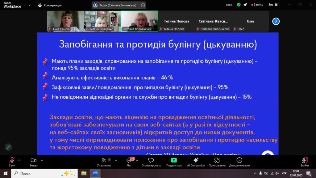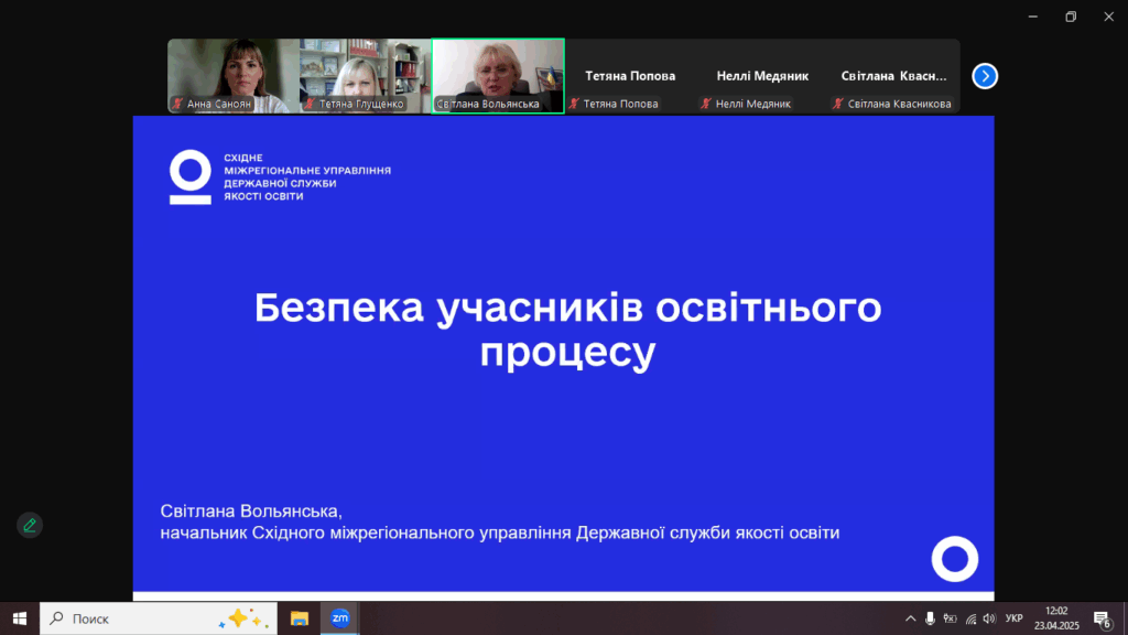23 квітня 2025 року відбулася онлайн-нарада, організована Східним міжрегіональним управлінням Державної служби якості освіти, на тему «Безпека учасників освітнього процесу».