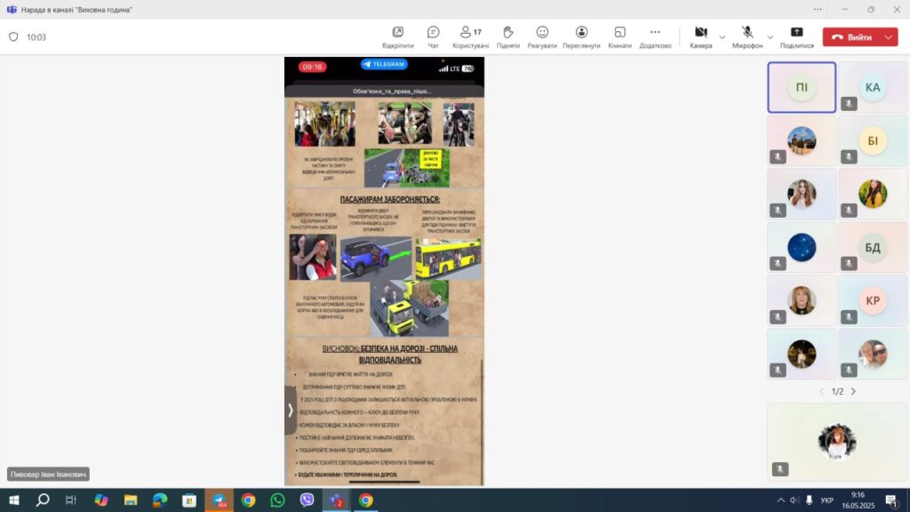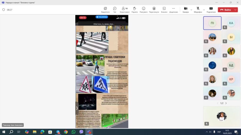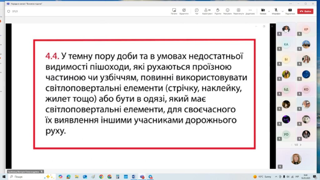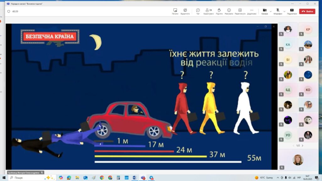Під час уроку студенти разом із викладачами обговорили основні правила дорожнього руху, значення світловідбивних елементів у темну пору доби, правила пересування пішоходів, велосипедистів та пасажирів громадського транспорту. Особлива увага була приділена питанням профілактики дорожньо-транспортних пригод за участі молоді.