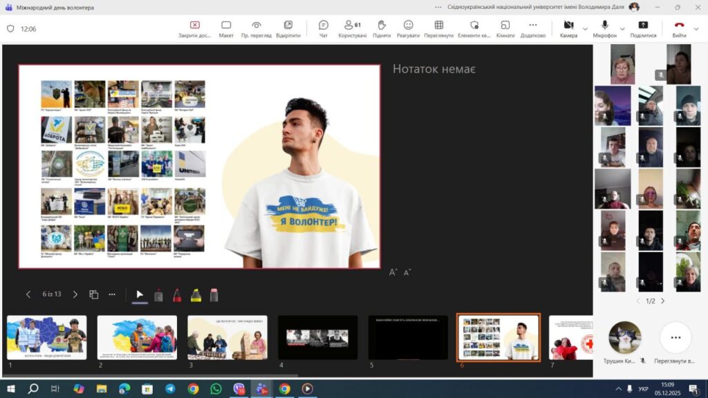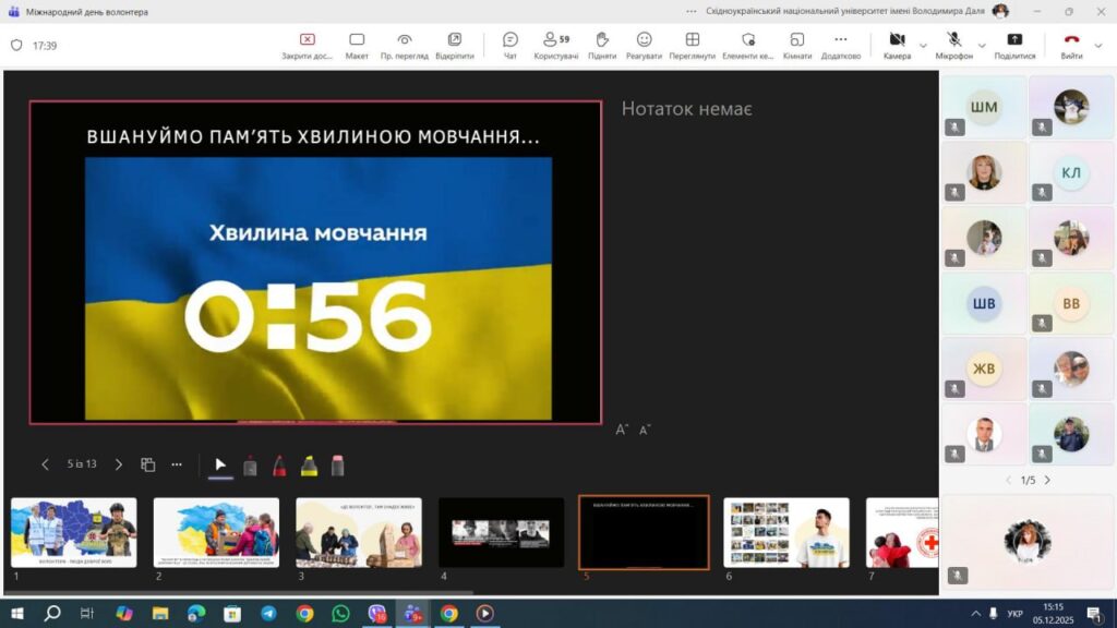 5 грудня 2025 року в нашому закладі освіти відбулася виховна година на тему «Героїзм українських волонтерів», присвячена Міжнародному дню волонтера. Захід підготувала та провела Шульга Ірина разом зі студентами груп В-11 та М-11.