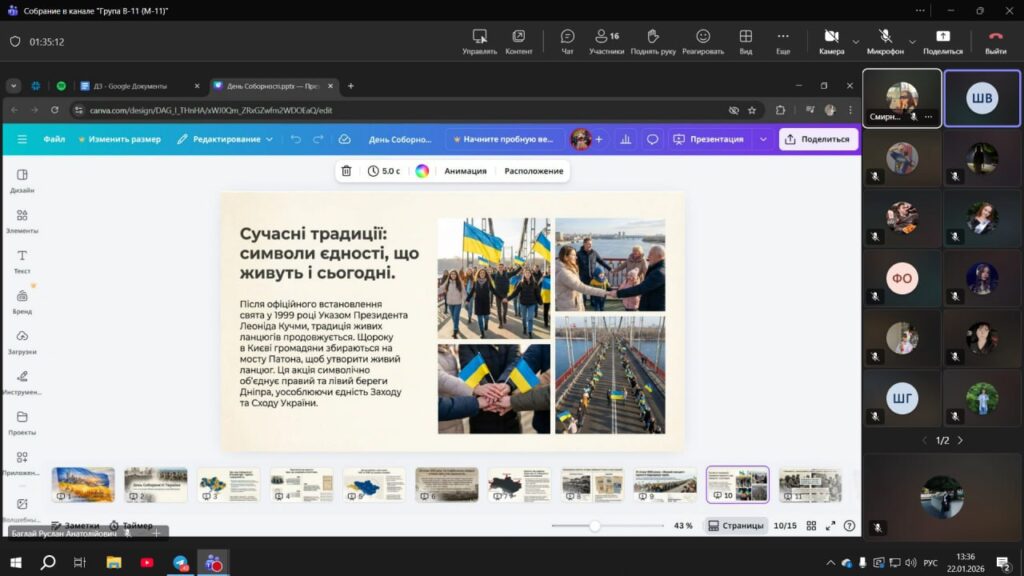 Студенти підкреслювали, що сьогодні соборність — це не лише територіальна цілісність, а й єдність цінностей, мови, культури, взаємопідтримки та спільної відповідальності. Звучали думки про важливість збереження національної ідентичності, подолання внутрішніх протиріч та інформаційних маніпуляцій.