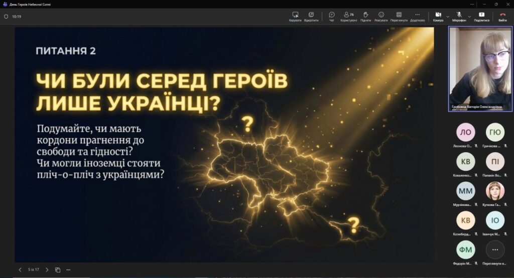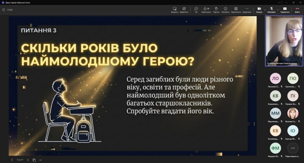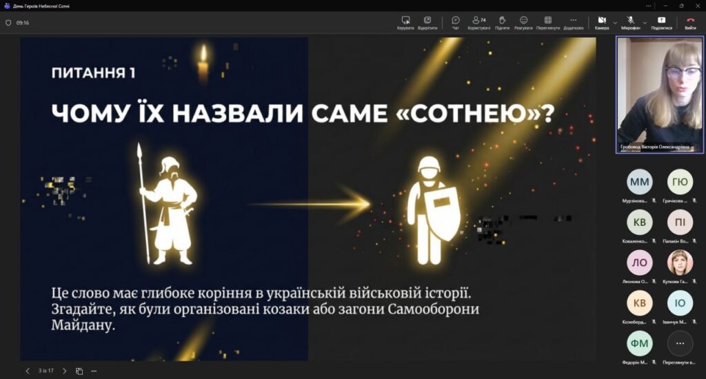 Розпочали день із тематичної бесіди «Герої Небесної Сотні — перші герої російсько-української війни». Під час зустрічі йшлося про трагічні події зими 2013–2014 років, кульмінацією яких стали розстріли мирних протестувальників у центрі Києва. Саме тоді Україна втратила понад сотню своїх синів і дочок — людей різного віку, професій і регіонів, об’єднаних спільною мрією про гідне життя у вільній державі.