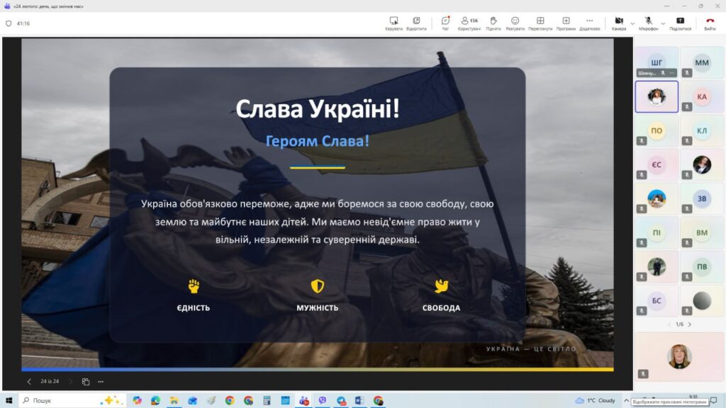 Також сьогодні Україна відзначає Національний день молитви за Україну — день духовного єднання, коли мільйони українців звертаються з молитвою за мир, перемогу, захист воїнів та майбутнє держави. Учасники виховної години говорили про силу віри, підтримки та внутрішньої стійкості, які допомагають нашому народові вистояти у найтяжчі часи.
